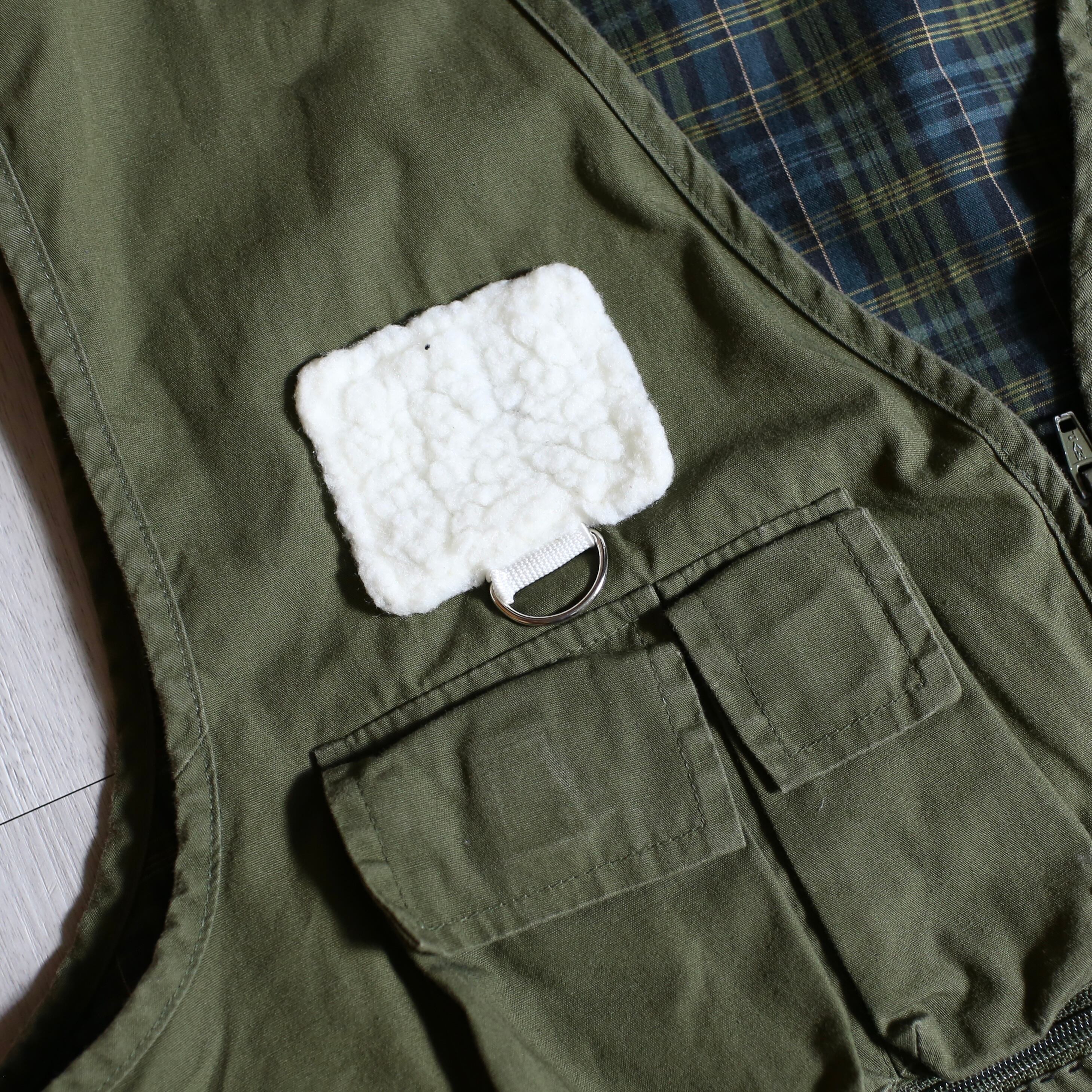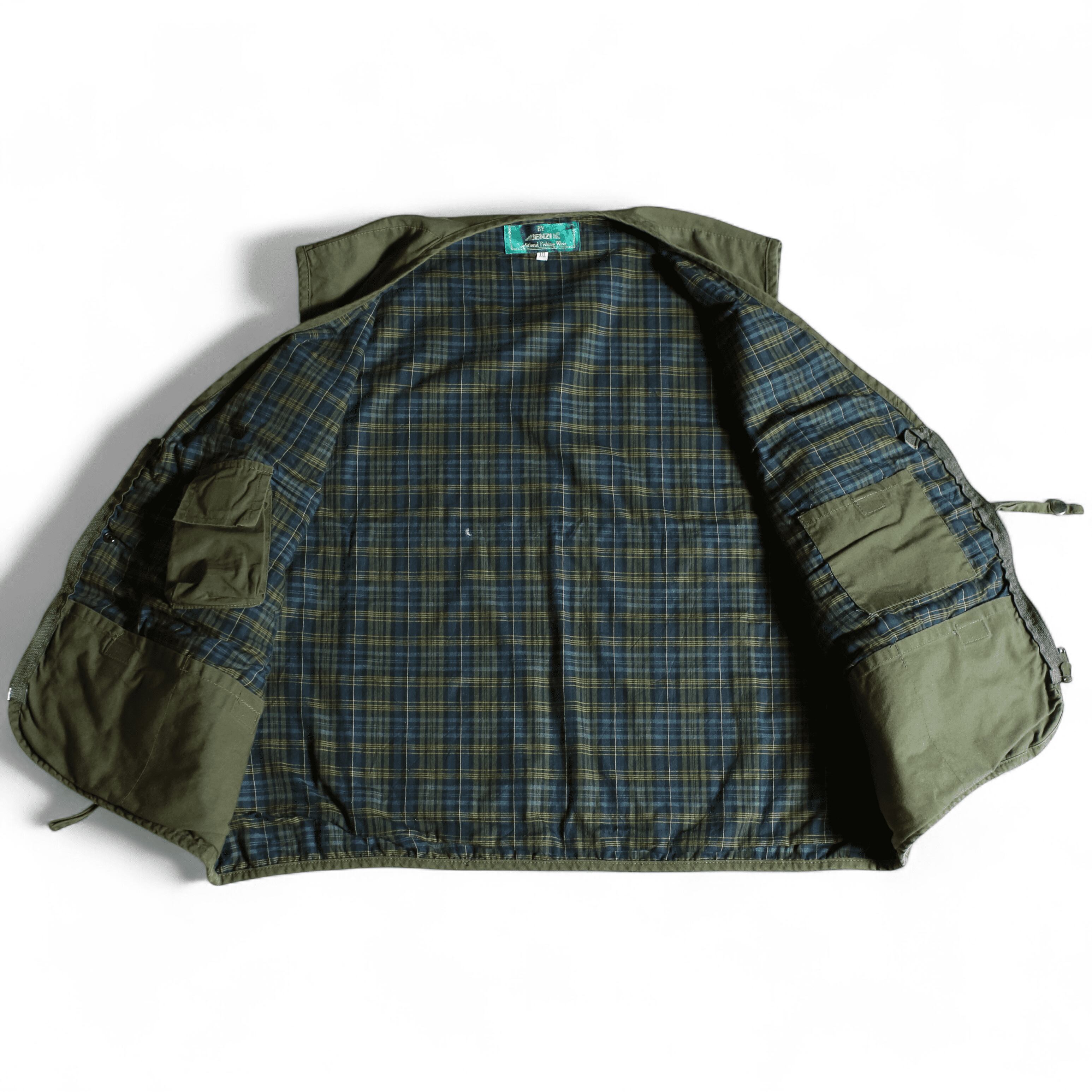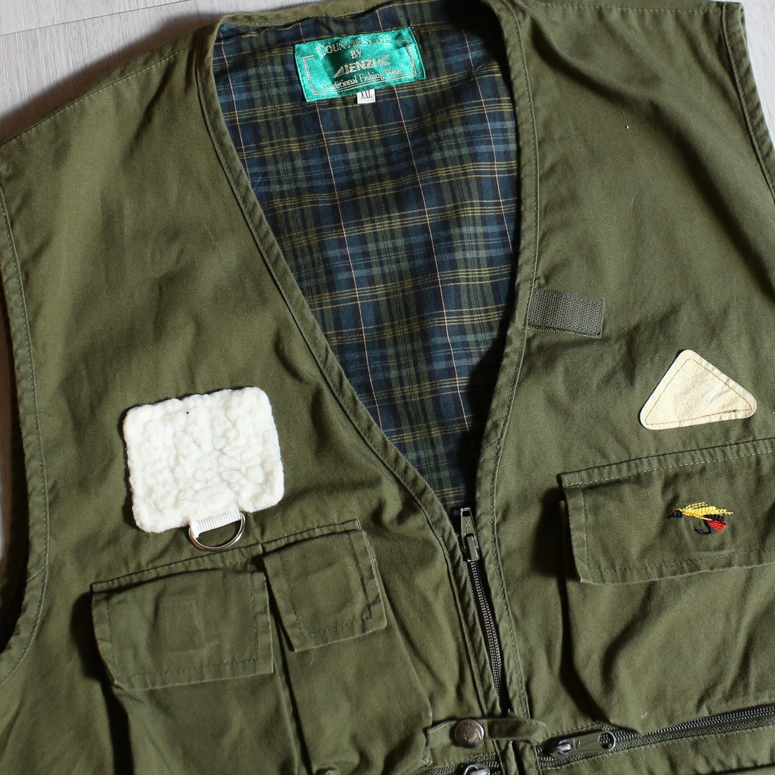 90年代頃のJENZI製フィッシングベスト。アウトドアウェアらしいオリーブカラーをベースに、チェック柄の裏地や随所の刺繍がアクセントになった1着。