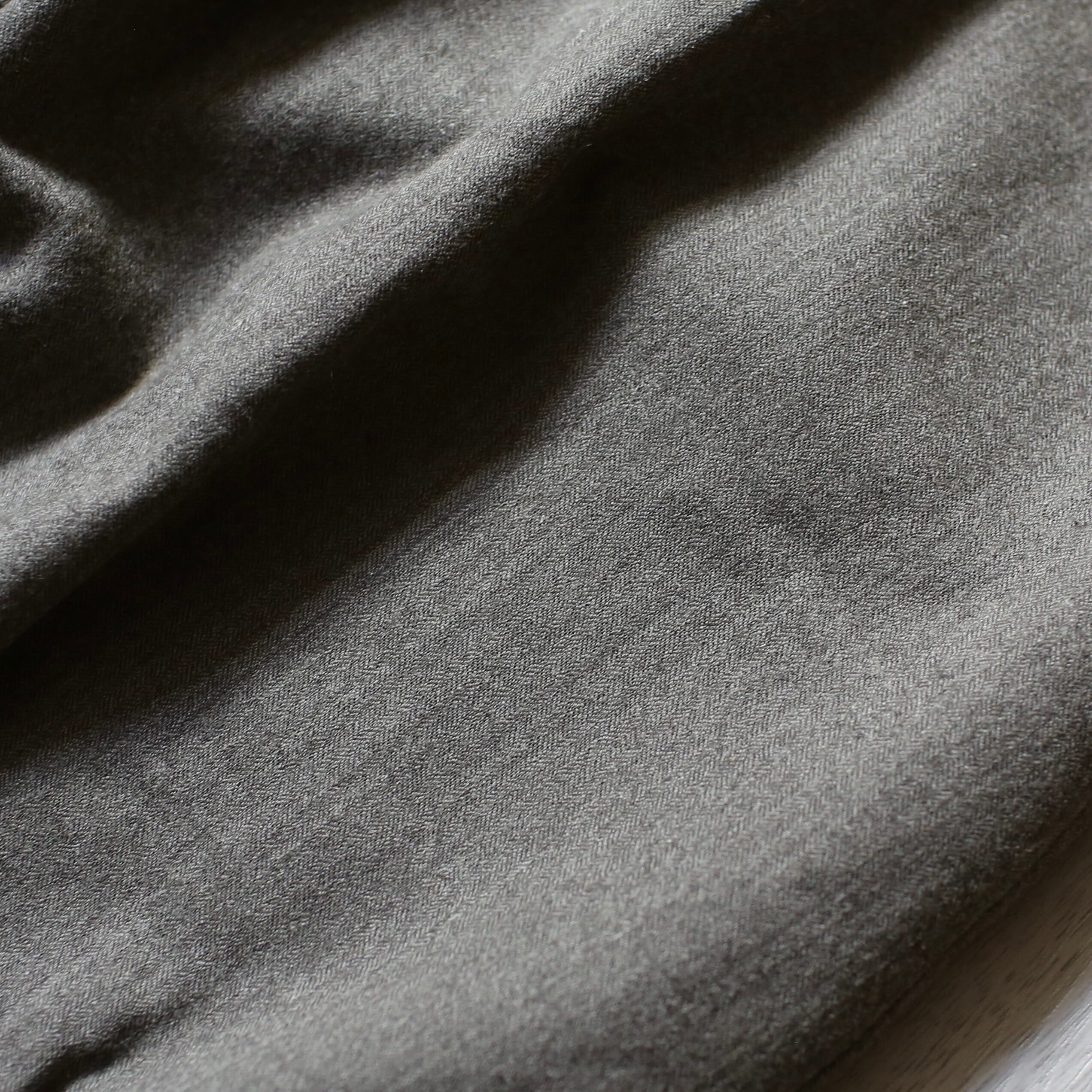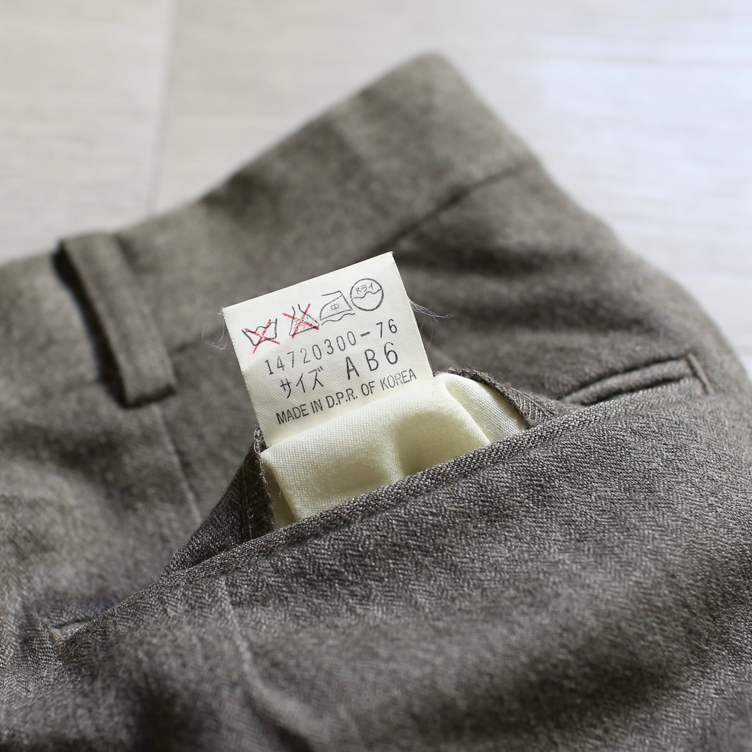 1990年代頃、北朝鮮製タグが付属した希少な一本。落ち着いたベージュトーンに、上品なヘリンボーン織が映えるスラックスです。