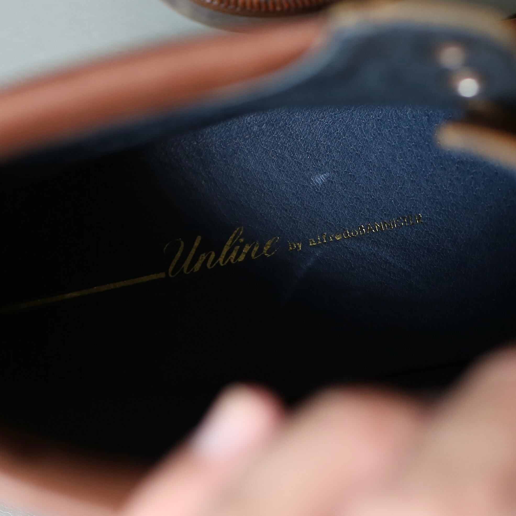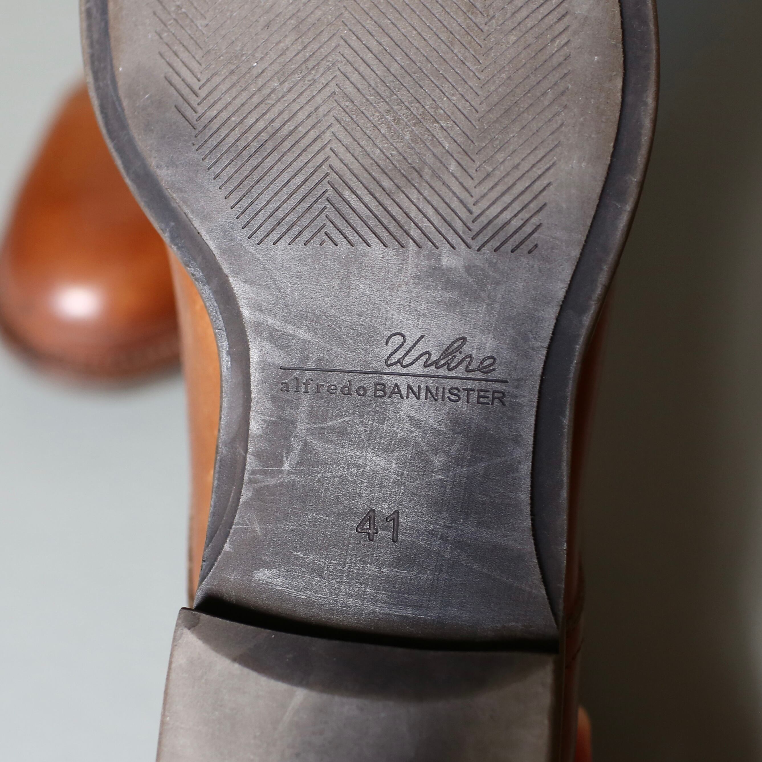 アウトソールには UNLINE by alfredoBANNISTER の刻印入り。シルエットは細すぎず太すぎないバランスの取れた、クラシックな一足です。
