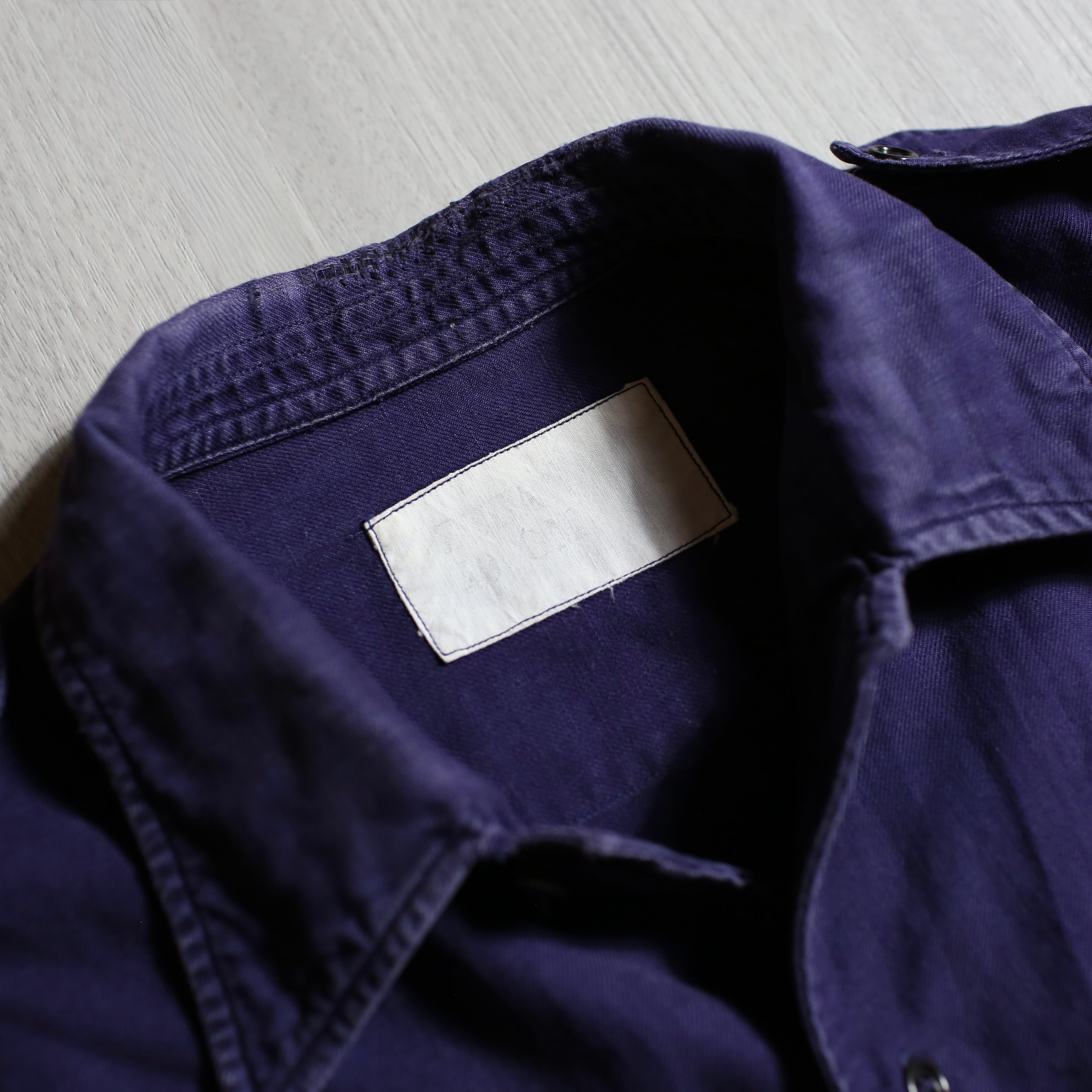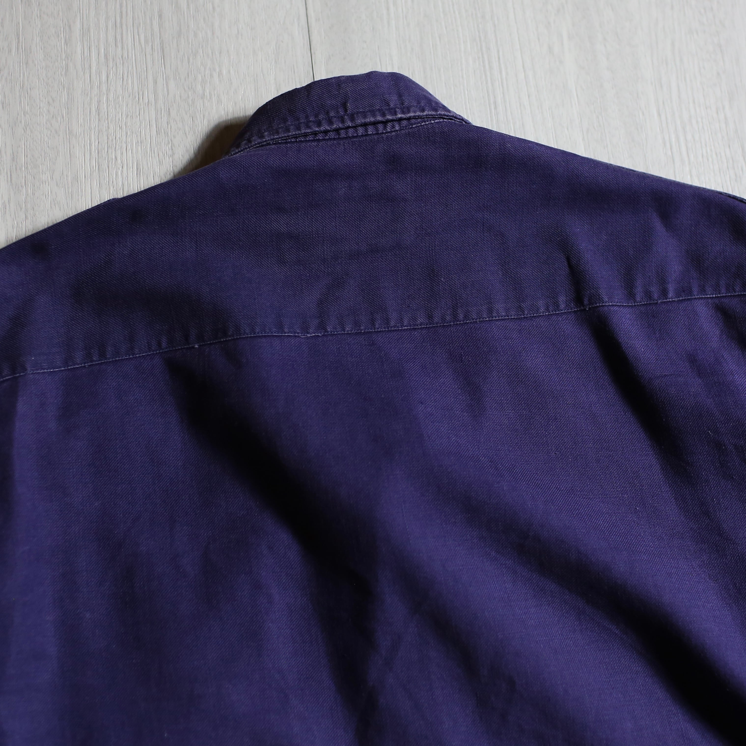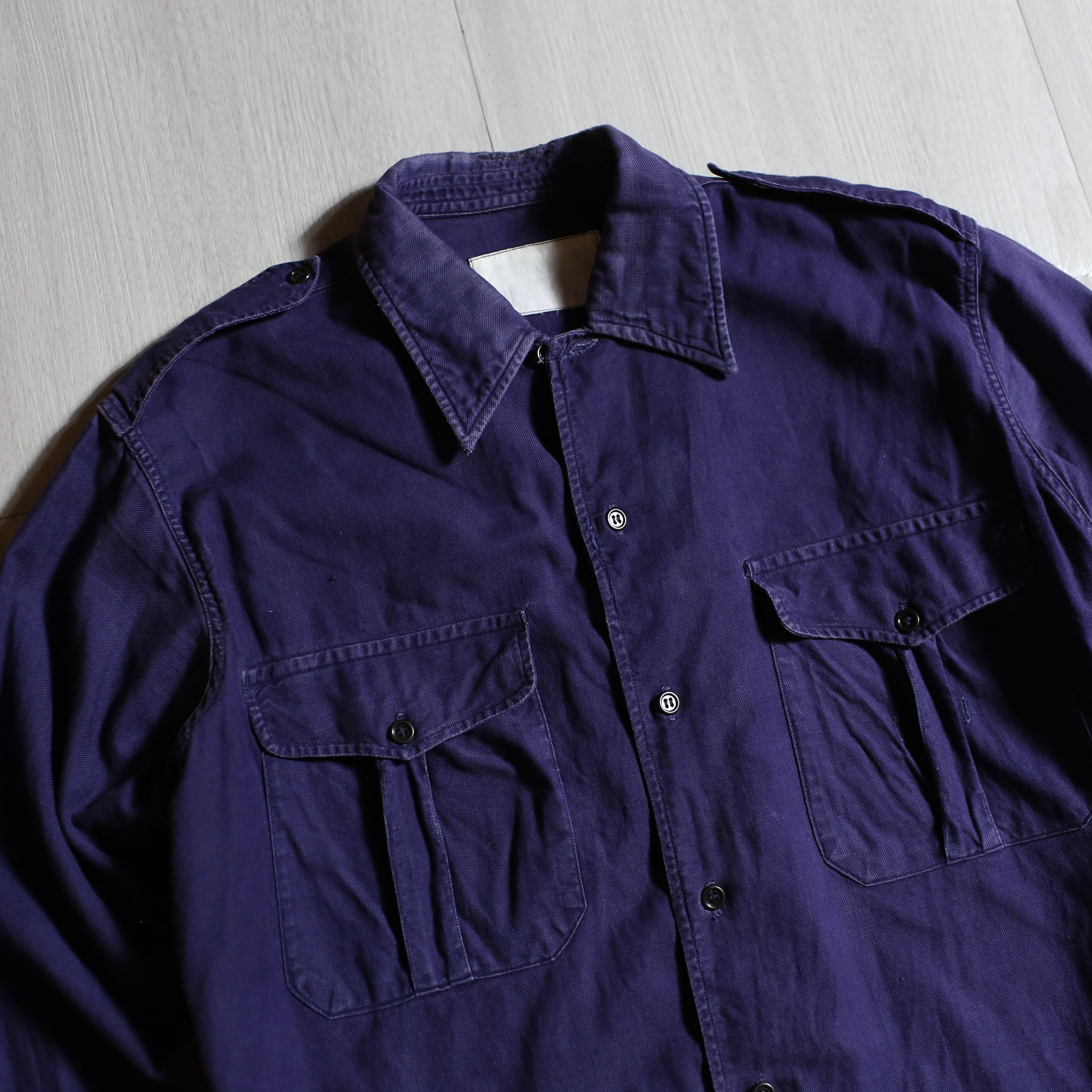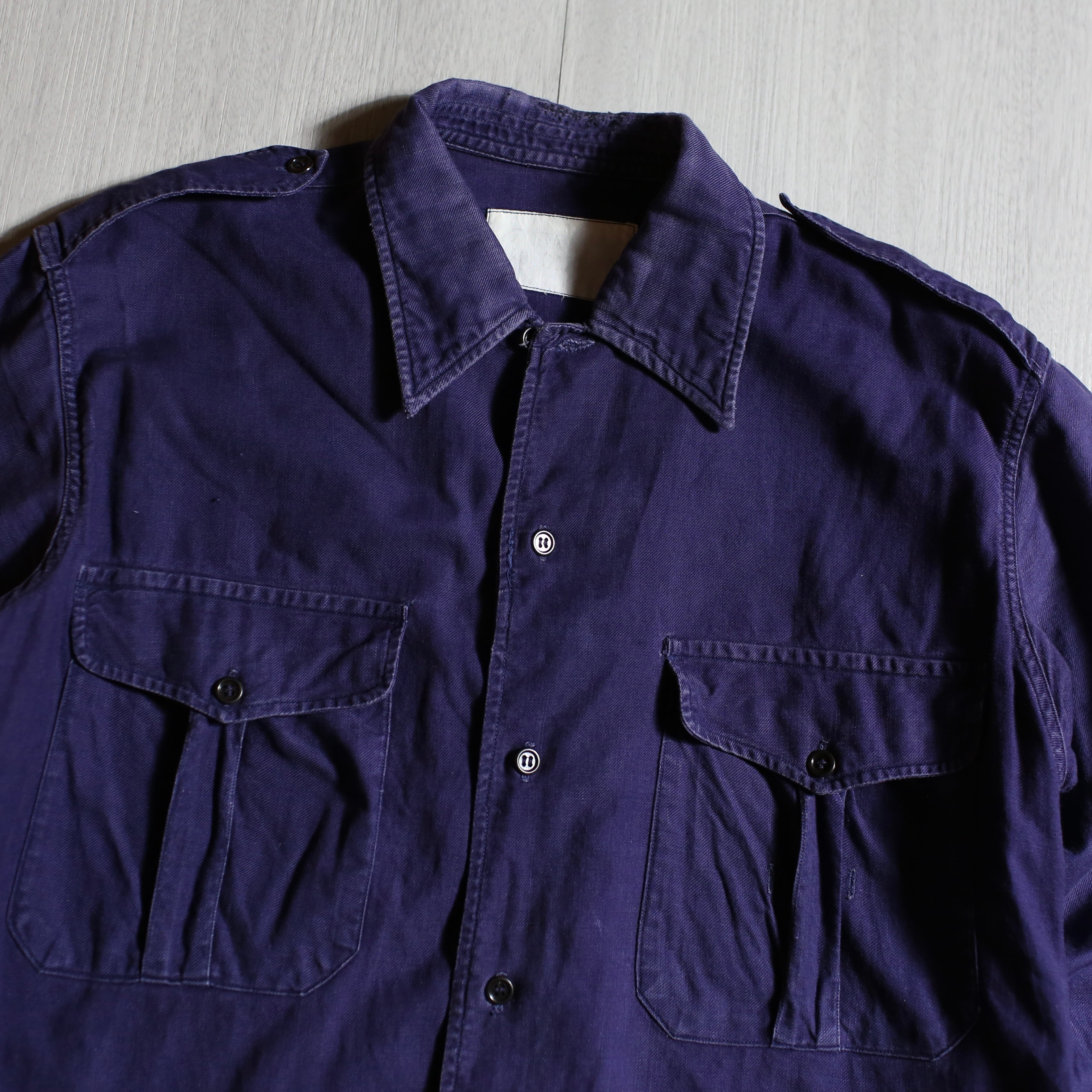 1950〜60年代頃のフランス海軍で使用されていたワークシャツ。品のあるナス紺カラーに、エポレットや深めにラウンドした裾など、機能美を感じるディテールが光る一着です。