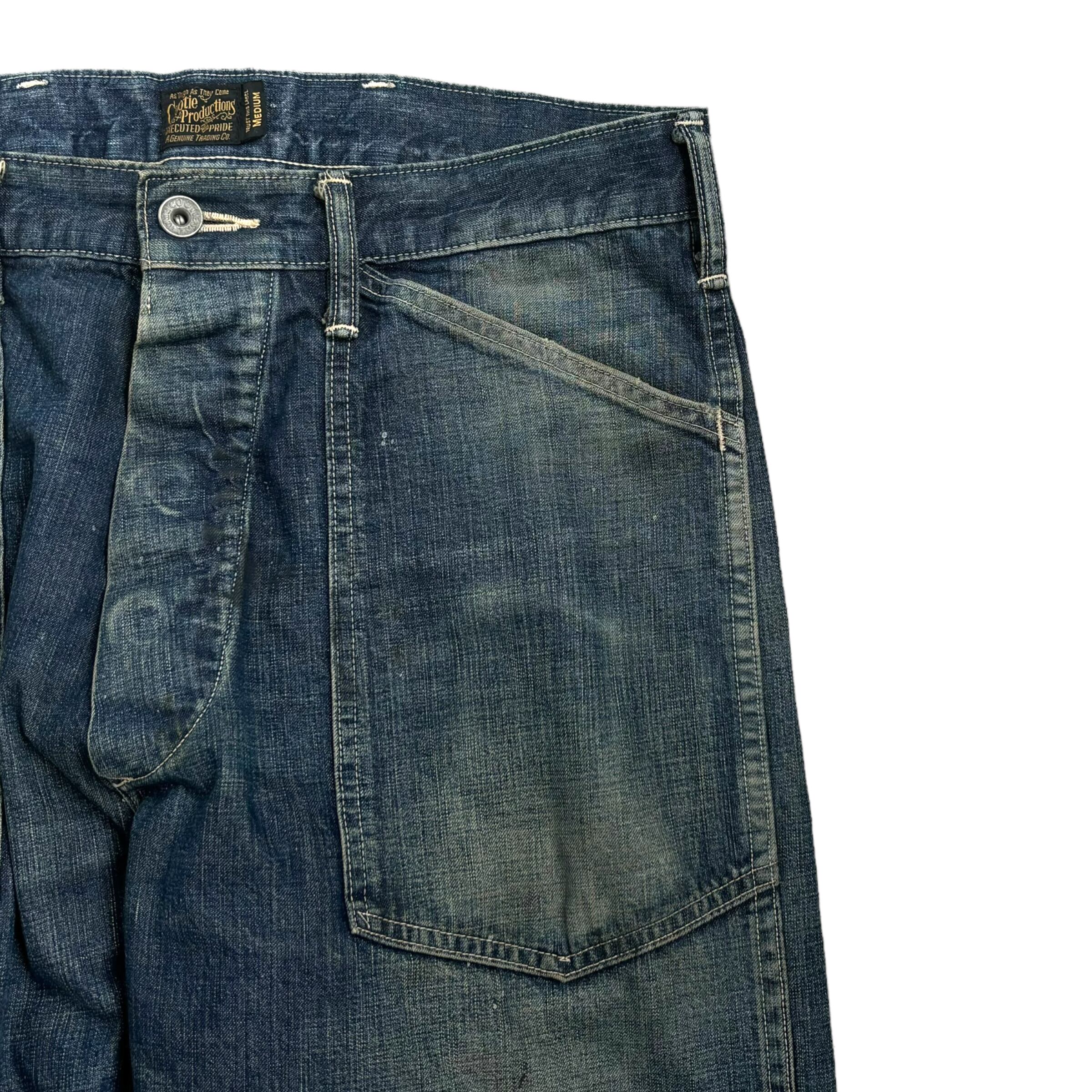 Cootie vintage style straight denim work pants クーティー ストレートデニムパンツ ワークパンツ 古着 ヴィンテージ調 インディゴブルー ペンキ ボタンフライ 縦落ち ドーナツボタン
