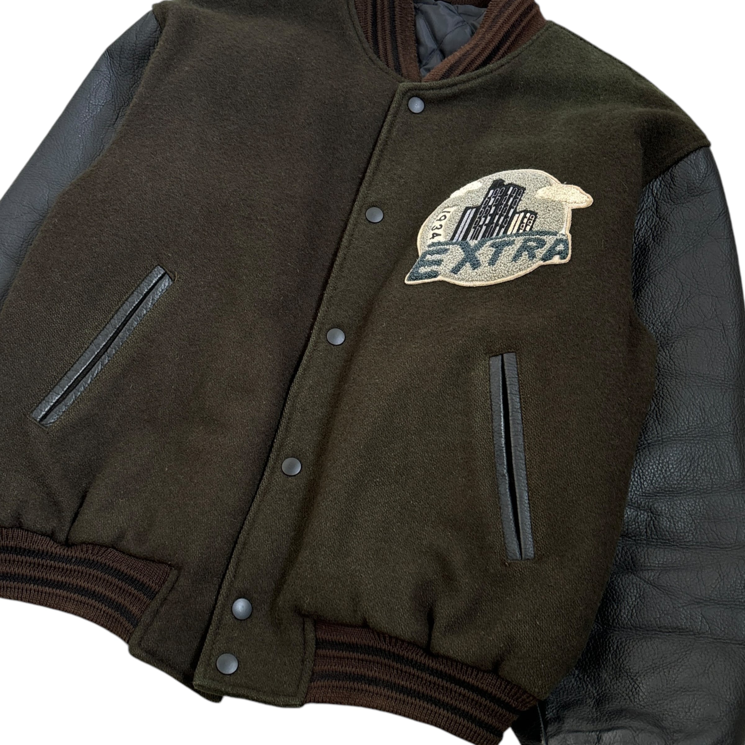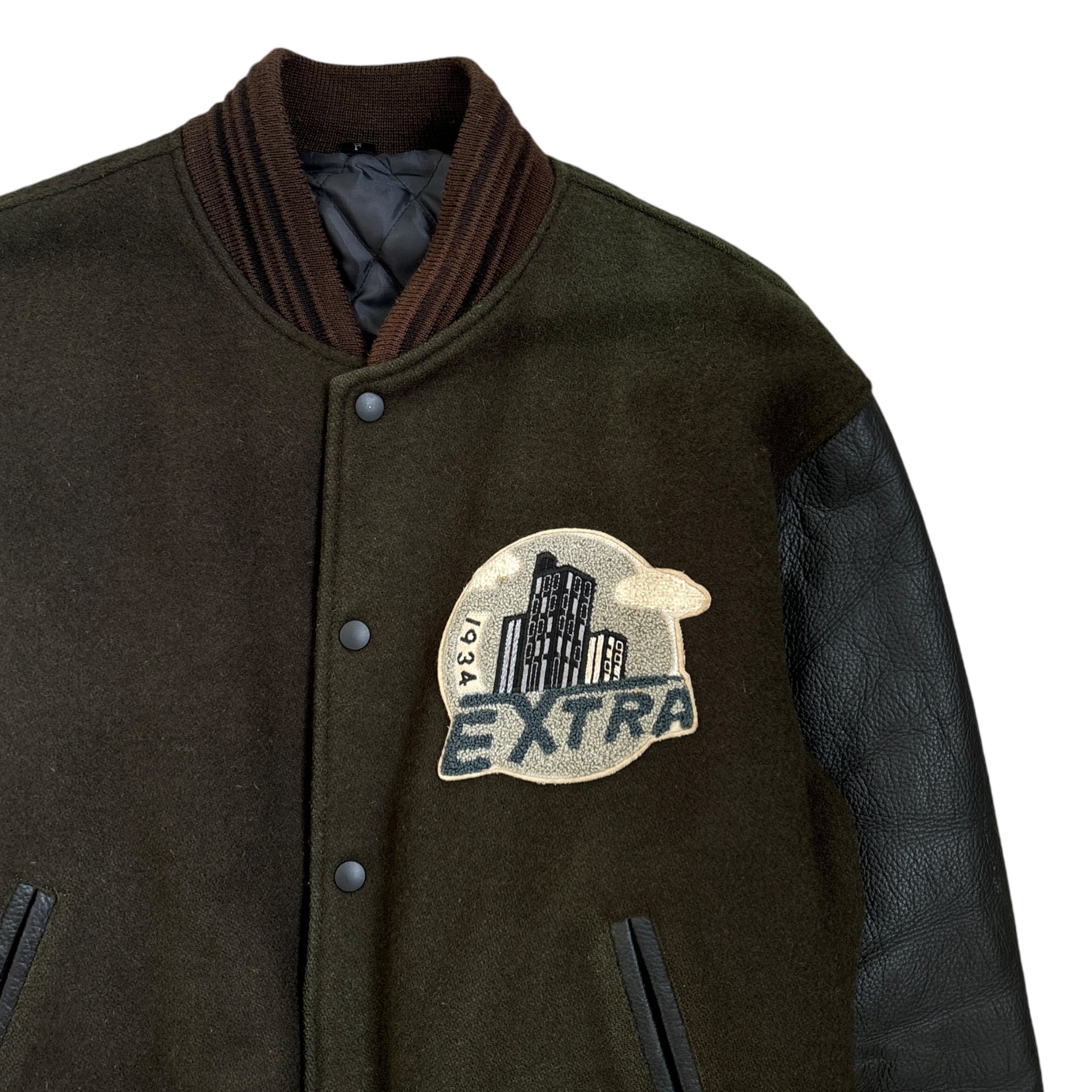 90s~ "EXTRA" Faded Wool Varsity Jacket 90年代 エクストラ ウールスタジャン 古着 カーキ レザー切り替え