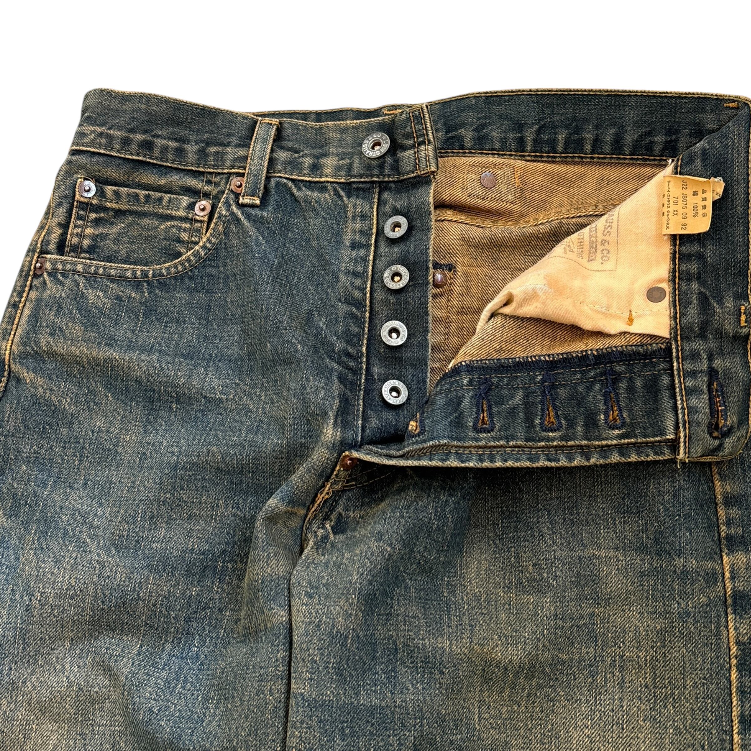 90s Levi's 701XX vintage style straight denim pants 90年代 リーバイス ヴィンテージ調 ストレートデニムパンツ 古着 復刻 ユーズド加工 日本製